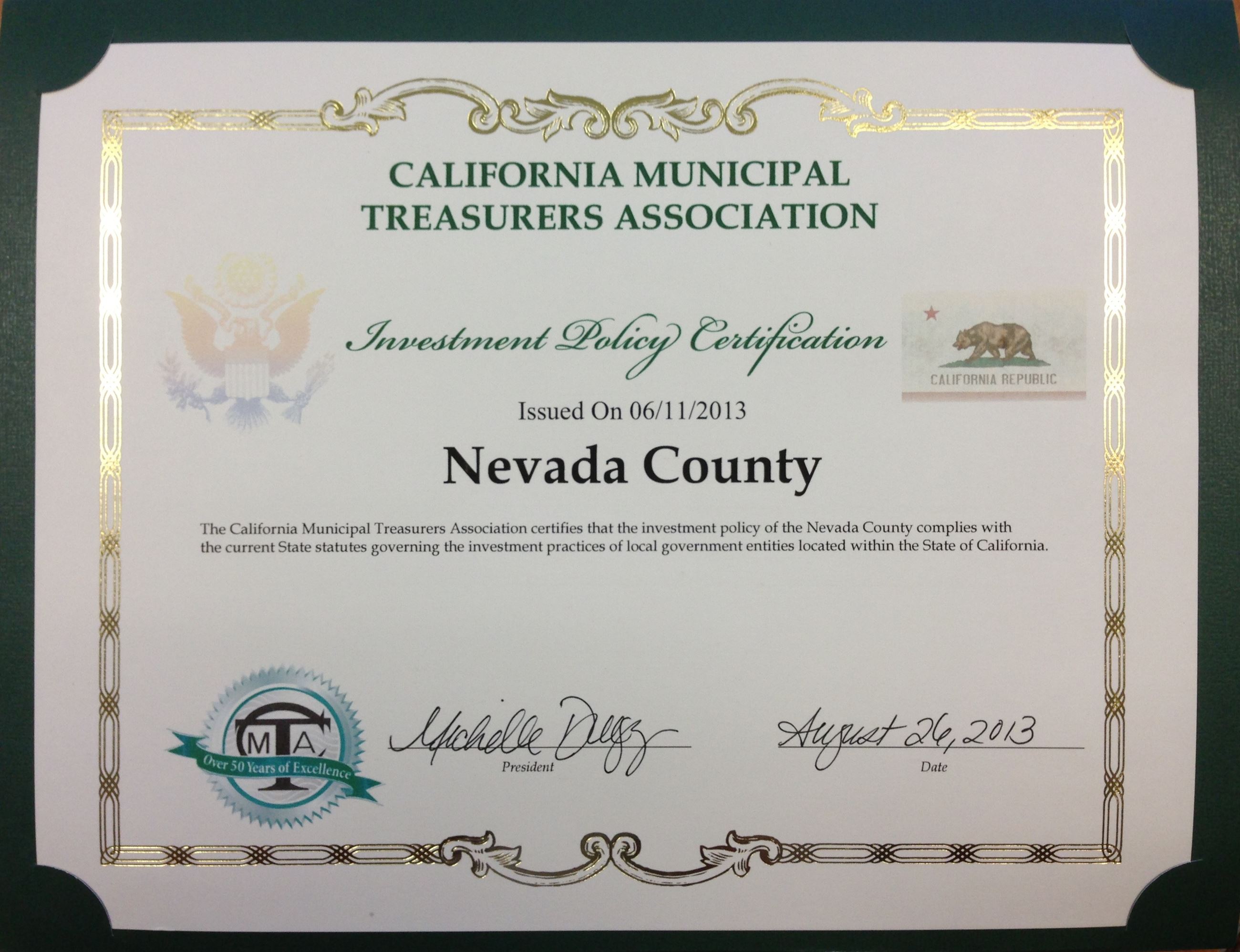 Annually, the Treasurer brings forth an Investment Policy to be adopted by the Board of Supervisors. Nevada County's Investment Policy has received Certification from the California Municipal Treasurer's Association and is the first California County to earn this certificate.