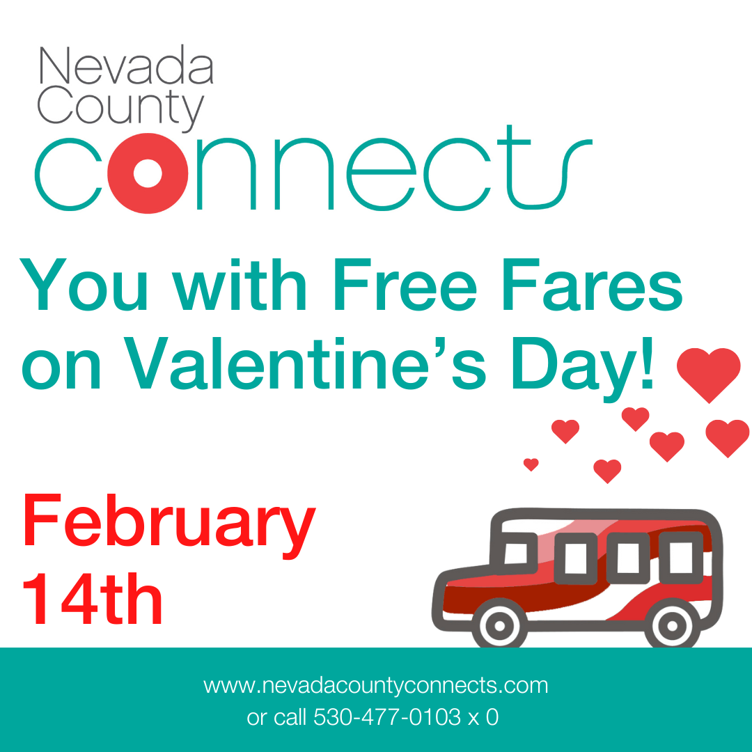 Nevada County Connects is sharing the love this Valentine’s Day, Saturday, Feb. 14, with free fares on all routes! Nevada County Connects will be operating normal schedules and times on all routes, and all riders can travel at no cost.
